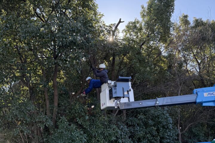 10メートルを超える高木を高所作業車を使用してかなりの本数伐採させていただきました。